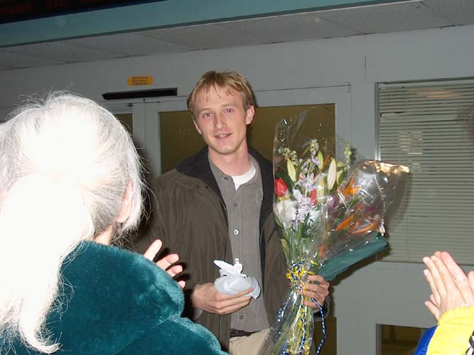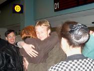 60多位多伦多大法弟子在多伦多机场等候和迎接杰森.E.劳福特斯的归来。杰森的母亲和妹妹也到机场迎接他的归来。在这熟悉的机场候机室,多伦多大法弟子今天是第四次迎接在北京天安门广场向世人证实大法的加拿大西人大法弟子了。他们是大法弟子乔尔.契普卡,大法弟子泽农,康妮.契普卡和杰森.E.劳福特斯。