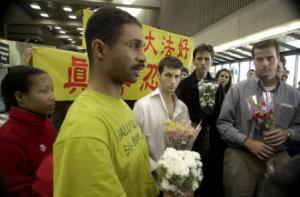 三名洛杉矶地区的西人法轮功学员天安门请愿后于2月15日晚7点30分到达洛杉矶机场,受到当地40多名同修的热烈欢迎。
