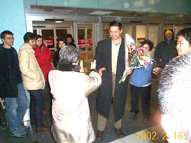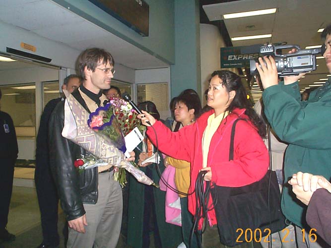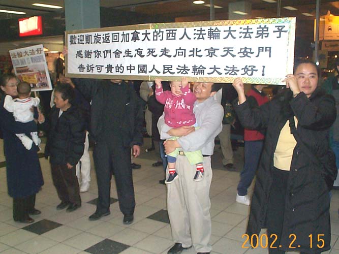 【明慧网2002年2月17日】140多名多伦多大法弟子今晚又来到了这熟悉的多伦多机场候机大厅,迎接当晚11:30将返回多伦多的两名参加天安门国际和平请愿的西人大法弟子归来。在机场候机大厅内,同修们手举刚刚赶制出的两面中英文展板,上面写着:“欢迎凯旋返回加拿大的西人大法弟子,感谢你们舍生忘死走向天安门,告诉可贵的中国人民“法轮大法好”。