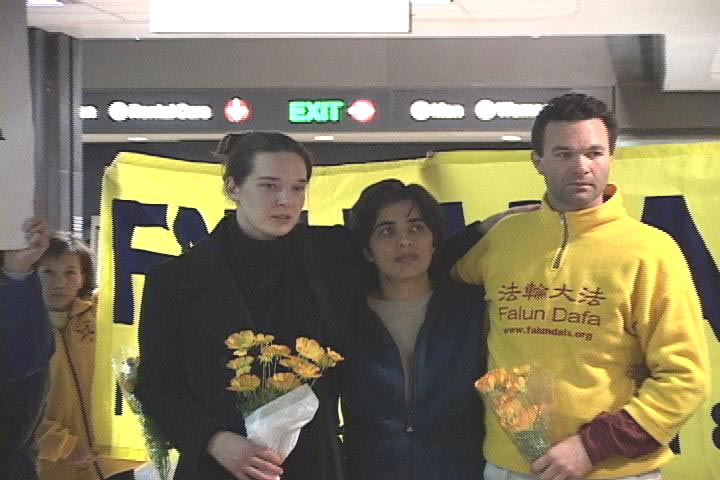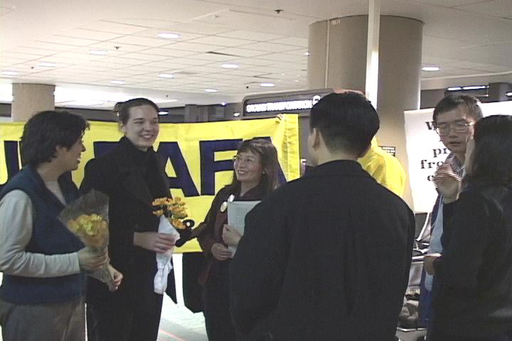 大卫、珍妮和爱莎先后经由温哥华,于6点20分前后抵达西雅图国际机场。早已经等候那里的家属和大法同修们,在一片祥和慈悲的普度音乐声中,手持鲜花和大法横幅,欢迎为了信仰自由和救度世人不惜一切、到法轮大法的故乡──中国去证实大法的西人大法弟子。