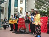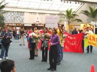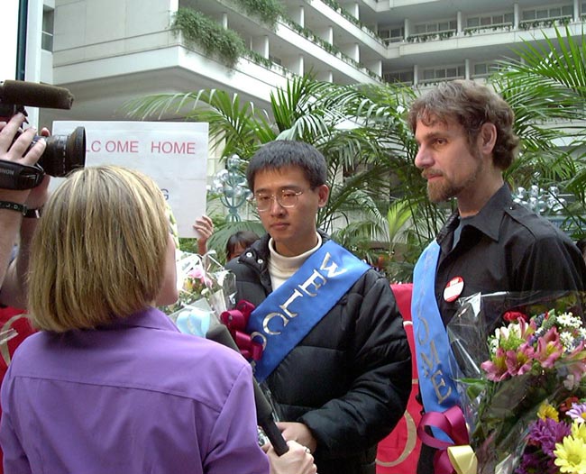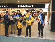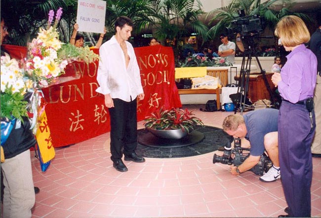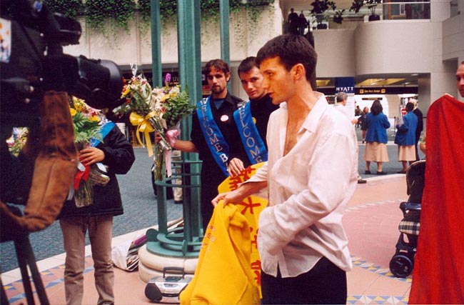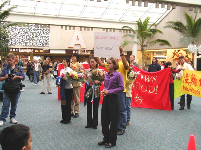 一点三十分,四位学员步伐坚定地拿着“法轮大法好”的横幅,唱着“法轮大法好”,出现在等待的众人面前。等待的同修亦唱着“法轮大法好”迎向前去,向这些走向天安门的同修献上美丽的鲜花,表达他们的敬意,大家都眼含热泪。这四位学员大多数脸上依然带着被打的伤疤,有的原来崭新的衣服已是破烂不堪。他们显得苍白的脸上呈现着刚毅和慈悲。周围的旅客无不被此景所震撼。当地最大报纸的记者上前采访学员,随后佛州大法弟子在机场大厅前召开了新闻发布会。学员向在场的人士通报了在中国发生的对真善忍的迫害并呼吁全世界爱好和平的人们站出来制止中国每日都在发生的虐杀。随后记者们对四位学员进行了逐个采访。