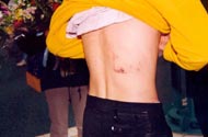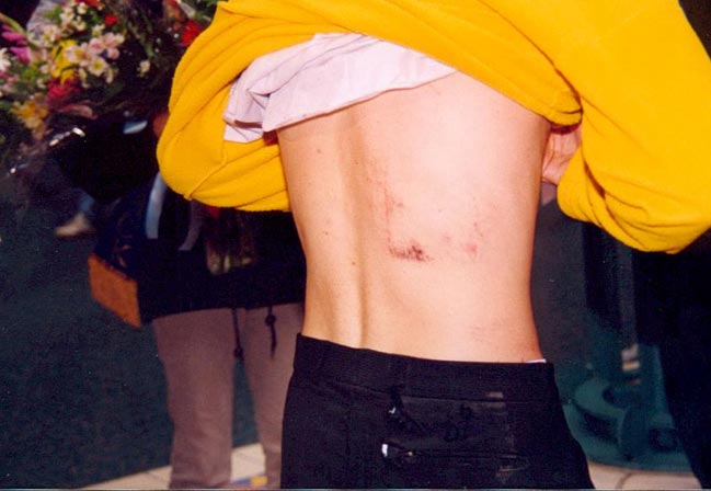 Court Pearman向记者详谈了在北京和平请愿的经过,以及遭受警察严重暴行的情景。他左眼眶拳伤清晰可见,衬衣上的纽扣被撕扯掉,裤子被划破,身上还带着被打伤时的泥土。当记者问及他的伤势时,他揭开了上衣,后背呈现出大片淤血。在场的旅客们走上前围观,都露出了惊诧的神情,纷纷询问在北京发生的事情。