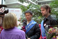这次去北京和平请愿的佛州大法弟子是Court Pearman和Jared Pearman兄弟俩,Chris Jasurek和台湾学员Corey Lee。这次到北京正法活动计划得十分周密,当地学员大都是从新闻上获知消息的。短短几天,学员们密切关注着事态的发展动向。奥兰多一位学员两天两夜没睡觉,赶制出了横幅及披带,又精心选购了鲜花带到机场。学员们高举着“Welcome Home”,怀抱着鲜花,拉着红色大横幅“全世界都知道法轮大法好”,在“法轮大法好”的歌声中迎接同修归来,场面十分感人。
