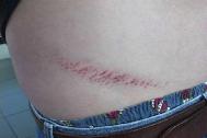 波士顿学员REARDON指着腰部的伤痕对记者说,“我在天安门广场上使劲不停地高喊‘法轮大法好’。好几个警察野兽般地向我扑来,拳打脚踢,妄想捂住我的嘴……”