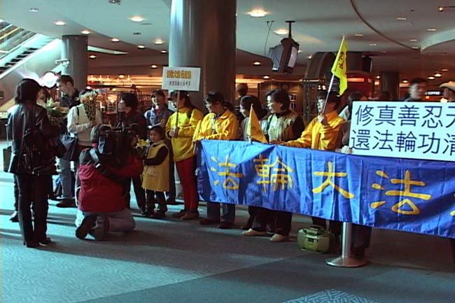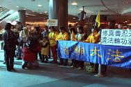温哥华本地20余名法轮功学员在机场举着横幅标语,在“法轮大法好”的背景音乐中,热烈地欢迎去中国为要求中国政府停止镇压而请愿的学员,当地10多家中英文媒体在机场耐心地等候了两个多小时,进行了现场采访。