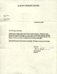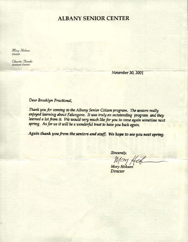 谢谢你们来到奥尔巴尼老人中心教功。老人们非常喜欢学法轮功。法轮功真是一个杰出的锻炼方式,他们从中学到许多东西。我们希望你们明年春天再来。那将是非常愉快的。
