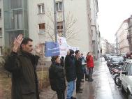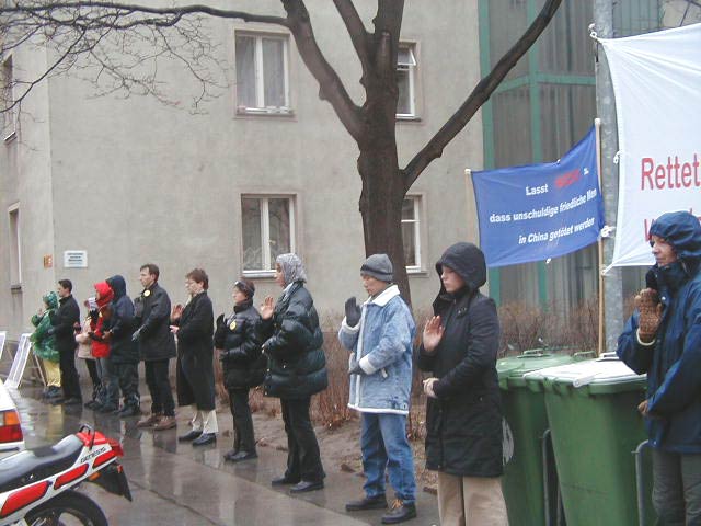 针对这一诬蔑,奥地利大法弟子在中国大使馆附近举行了和平的抗议活动。“ 通过这次活动,一方面我们想对使馆的诬蔑表达抗议,另一方面借此来说明法轮功及其在中国受迫害的真相。”学员们在使馆前炼功并展示在中国镇压法轮功的图片,同时展出了对上述“自焚”真相分析的详情。