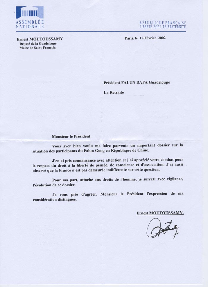 我认真地了解了情况并高度评价你们在尊重思想自由、信仰自由和结社自由的权利方面的奋斗。我也注意到法国在这一问题上不是无动于衷。