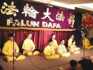 | 明慧学校的小弟子的文艺演出 | 西方学员演唱歌曲“法轮大法好” | 中西学员演示法轮功功法 |