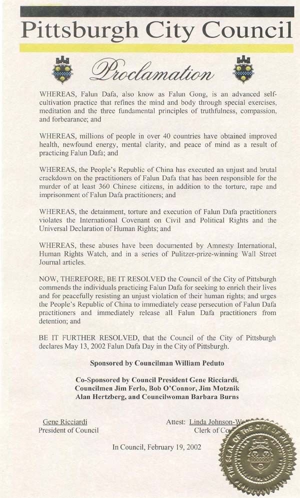 进一步决议,匹兹堡市议会宣布2002年5月13日为匹兹堡市的法轮大法日。