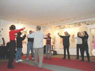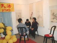 今天我们在拍照时她又来电话,约好6点钟来画展向我们学功。她特别聪明,很快把五套功法全学会了,而且马上就能双盘。她还采访了几位学员。临走时还真诚地请了《转法轮》回去拜读。