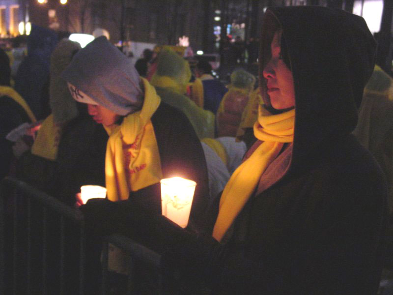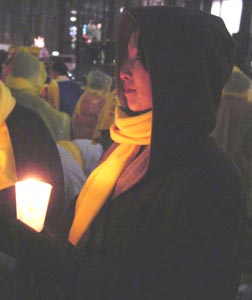 1月31日晚,大约200名法轮功学员在世界经济论坛会场曼哈顿华尔道夫大饭店前面举行了一次烛光悼念活动。这是前来参加大纽约地区经验交流会的学员们举行的许多活动之一。这些活动的中心目的是为了向商界精英们讲清在中国发生的这场迫害的真相。