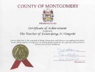 宾西法尼亚州蒙特苟马力郡授予法轮功创始人李洪志老师荣誉证书,以褒奖他致力于“真善忍”的传播,让四十多个国家的上亿的人习炼这种具有精神追求的中国传统功法。
