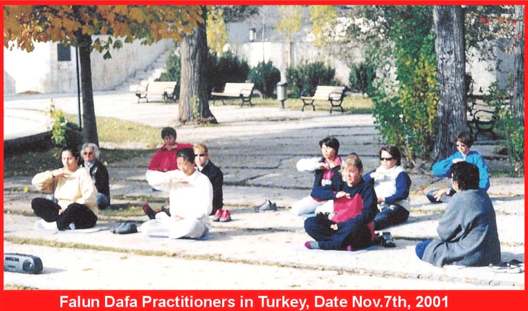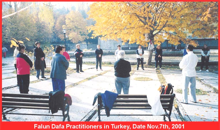 随附土耳其大法弟子2001年秋天在公园炼功时的照片。