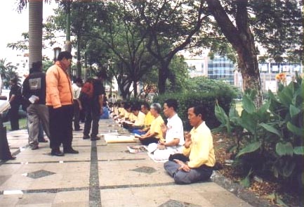 | 学员静坐、学法,吸引民众惊叹、称好 | 学员静坐发正念,路过民众与媒体正在注视中国残酷迫害法轮功学员的图片 |
