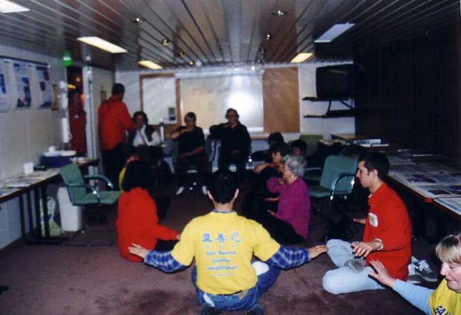 图一:这是2001年冬天我们应邀在游艇上展示法轮功。图二:这是2001年夏天我们举行旨在让公众了解迫害真相的SOS紧急救援步行之前拍摄的照片。我坐在右边。