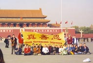 图三:这是2001年夏天我们在驻高森堡(Gothenburg)中国领事馆前炼功和请愿的图片。图四:这是2001年11月36名西方法轮功学员在天安门广场和平请愿的图片。