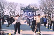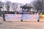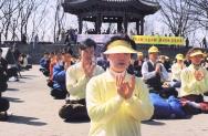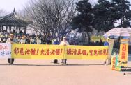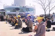 3月10日,虽然只有两天的准备时间,但来自汉城,大邱,釜山,光州,大田等地的240余名学员云集在汉城南山铁塔广场。12时30分,学员们展出了大法图片,挂出“反对江氏‘杀无赦’”、“声援中国大陆法轮功弟子”等30余横幅与几十个横牌,宣读了佛学会的声明书,向众多的观光游客与休闲的人们讲清真象,无论是上山还是下山的游客人人手里都拿着大法真相资料。