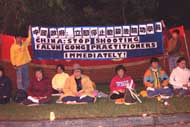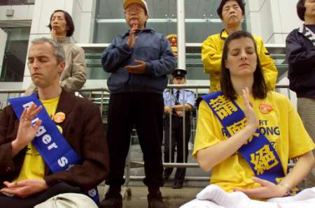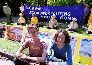 消息说,抗议者们身披要求中国国家主席江泽民停止屠杀法轮功学员的蓝色缎带,他们说到中国的入境签证被拒绝了。最近已有数位外籍法轮功学员因在北京示威被驱逐出中国。