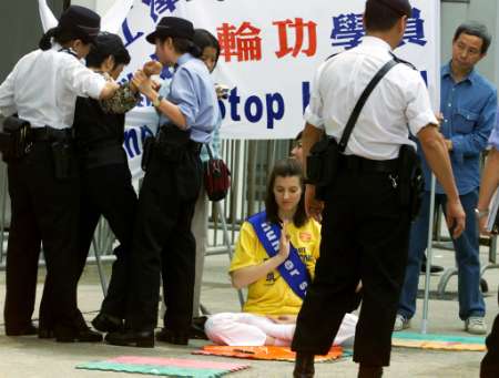 香港警方在3月14日发出第四号新闻公布中,宣称昨天在中联办警方强力搬走静坐的法轮功学员的过程中,“某些请愿人士反抗,令五名警察受轻伤,受伤警员有胸口被踢,亦有一名警员手臂被咬伤”。在昨日深夜仍被警方无理拘禁的法轮功学员严正澄清:法轮功学员一贯按照和平、非暴力的“真善忍”精神处事待人,绝无法轮功学员伤害警员之事,而有关警员手臂被(学员)咬伤云云,纯属别有用心的污蔑之词。相反,在警察动粗的过程中,有9名学员受伤。但学员要到医院验伤,却受到有人故意拖延与掩盖真相。对于上述有关方面知法犯法的行为,法轮功学员保留依法追究的权利。
