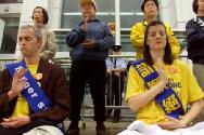 今天(3月13日)是第一天。清晨,9点钟,天灰蒙蒙的,第一批绝食学员已到达国会山上。11点,第二批50多人到达,在早春的料峭寒风中,学员们坐在消融的残冰上炼功、发正念,背后是写有“制止中国枪击法轮功学员” “紧急营救:在中国被虐杀的法轮功学员” “法轮大法”等字样的横幅。学员们的正念之场笼罩着偌大的国会山庄。