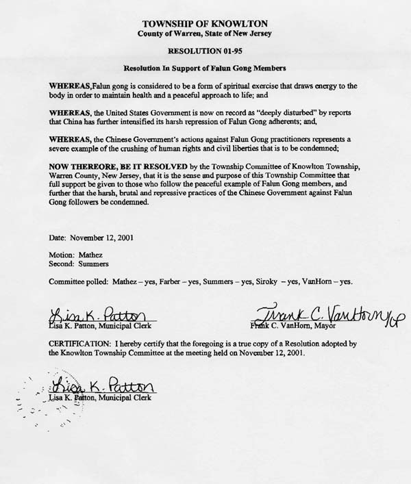 【明慧网2002年3月15日】美国新泽西州华伦郡诺尔顿镇委员会2001年11月12日通过一项支持法轮功成员的决议,决议号为:01-95。决议内容译文如下。