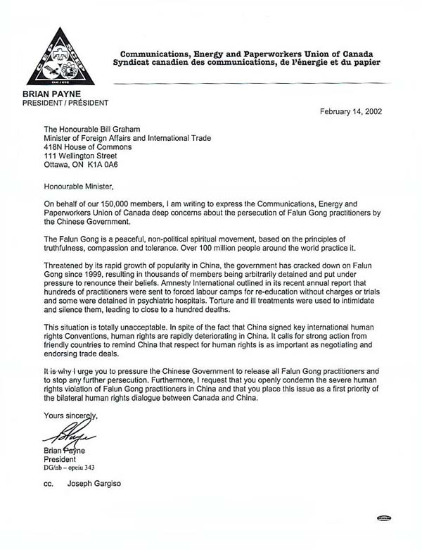 我代表加拿大通讯,能源,造纸业工会联盟的十五万名成员,就中国(江泽民)政府迫害法轮功学员一事,写信向您表达我们的深切关注。
