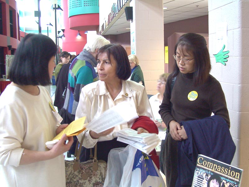 一年一度马里兰州蒙哥马利郡主办的妇女健康展览会于贝莱尔高中举行。“法轮功”亦是一百多个展位之一。一早开始,几位大法弟子就忙着发资料并。马里兰州及蒙郡多位众议员先后光临会场,也都停留在我们的展位,得到了大法的资料,并且说:“我们都明白法轮功在中国被镇压的这些不幸的情况,我们深感同情。”其他所有在我们展位停留的来宾,也都了解了法轮功在中国被的真相,表示非常地难过和不平。一位乔治城大学政治系教授仔细地问了很多的问题,收集了很多的资料,临行时主动在‘呼吁停止镇压法轮功’的单子上签了名。隔壁展位的老太太跟着大法弟子炼功后,取了英文资料外还拿了许多中文资料要送给她的中国好朋友。还有一位正义的老太太,问清了更多的真相后表示要直接写信给‘罪魁祸首’。