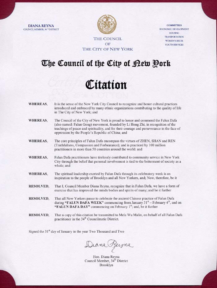 【明慧网2002年3月20日】纽约市市议会2002年1月31日签发嘉奖令,褒奖法轮大法。