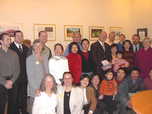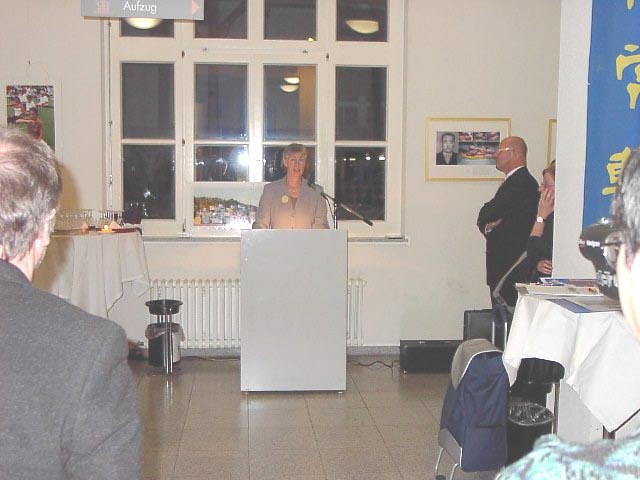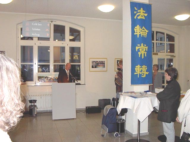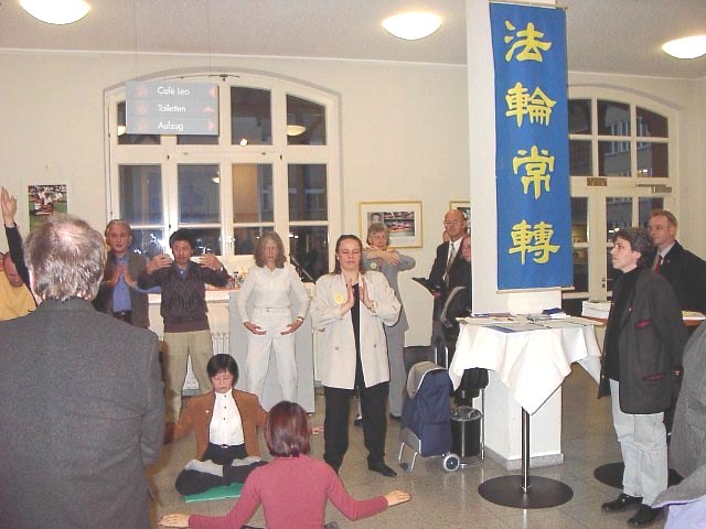 接着,来自法兰克福一位大法弟子介绍了二零零一年西人弟子在北京天安门广场的壮举。最后,国际特赦组织的克莱因先生详尽地讲述了在中国各式各样的侵害人权的情况。一些同修们展示了五套功法。冯德博士被这些柔和安静的炼功动作,和同修们的祥和所感动。
