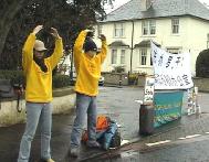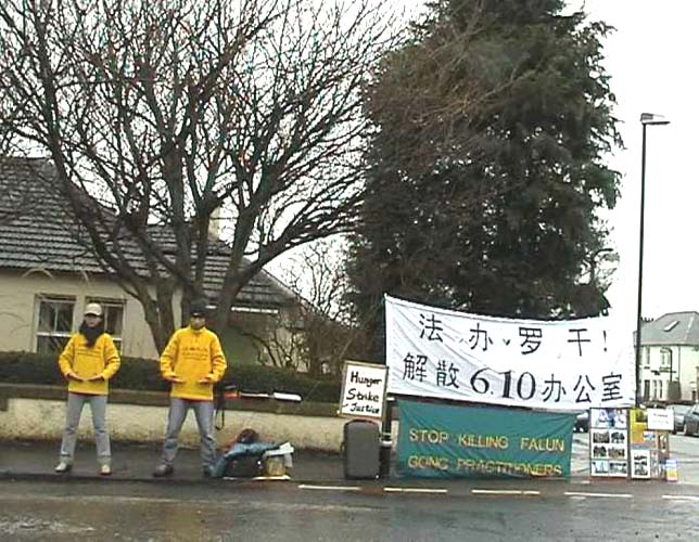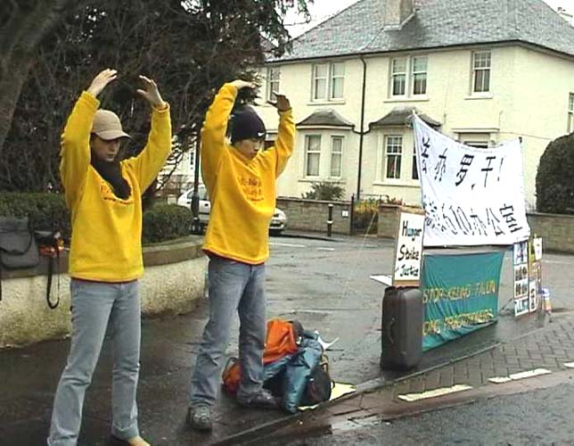 为抗议“杀无赦”的邪恶命令,声援国内同修,大法弟子哈菁在爱丁堡中领馆对面开始了48小时的绝食请愿。同时,英国其它地区的大法弟子也来到这里声援绝食的弟子。弟子们随着优美的炼功音乐炼功,并每小时定点发正念铲除邪恶。