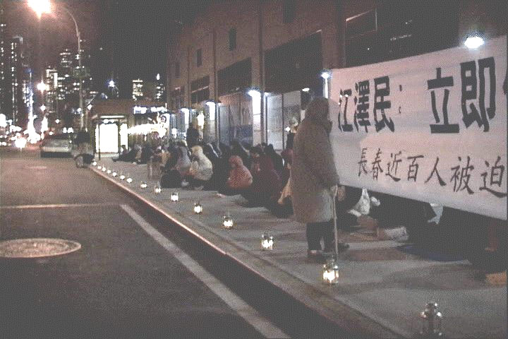 3月5日长春电视播放法轮功真相片以来,吉林省警察一直在进行大搜捕,被绑架的大法弟子已有5000多人,几乎每天都有大法弟子被迫害致死,长春大法弟子处境非常艰难。大纽约地区法轮功学员今晚来到中领馆前举行烛光守夜活动,他们举着“江泽民:立即停止在长春的屠杀”的横幅,炼功、发正念,紧急呼吁善良的人们伸出援助之手,共同制止江泽民流氓政府对法轮功学员的大面积屠杀。