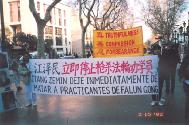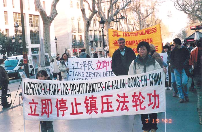 3月14日上午,部分学员来到中国驻巴塞罗那领事馆递交请愿书,同每次一样,领事馆大门紧闭无人应答。学员们将请愿书投放到领馆信箱中。学员们在领馆对面拉起“停止迫害法轮功学员”、“江泽民:立即停止枪杀法轮功学员!”、“迫害法轮功,天理不容”……等标语横幅,开始发正念和炼功。并向过往车辆及行人发放真相传单,经过这里的人看到我们举的标语横幅,几乎都停下来问为什么?我们就把在中国发生的残酷迫害法轮功学员的事告诉给人们,听了我们的讲述后,人们纷纷表示理解和支持,有的主动提出要在给中领馆的请愿书上签字。