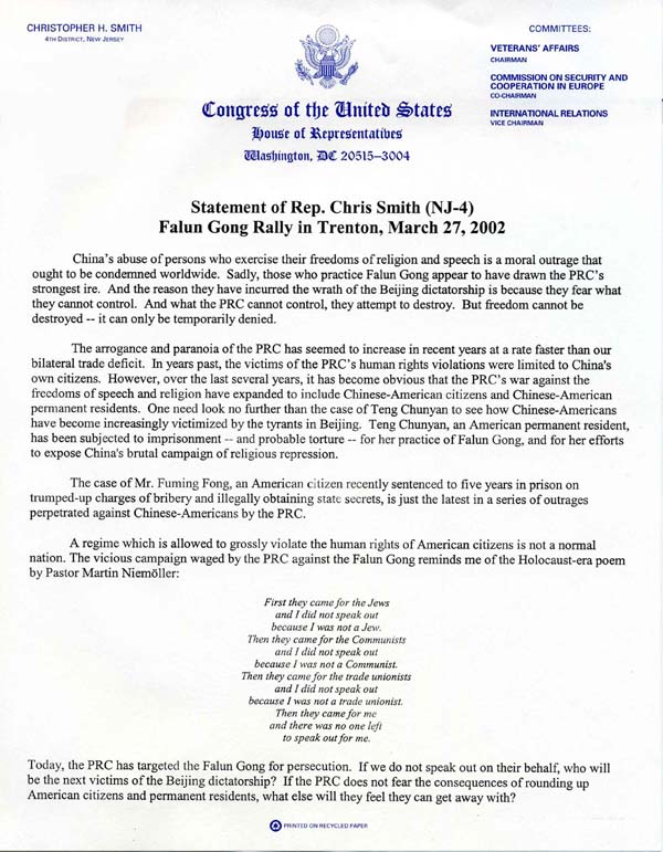 【明慧网2002年3月30日】以下为新州第四选区克里斯托弗.史密斯众议员2002年3月27日在川顿(Trenton) 的法轮功集会上的声明: