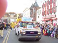连续数年在游行队伍的主席台前,都特别有一个由气球扎成的拱门装饰,今年也不例外。一早就由大法弟子率领明慧学校的小弟子们到达唐人街会场等候制作拱门,并帮忙布置主席台。但等候许久仍不见所需的氦气筒,而后得知主办单位出些小状况,氦气筒得午后才能运到。而游行队伍及节目将于下午两点半开始,时间极其有限。但大法弟子都明白,凡事必有原因,除了不断的发正念外,并不着急。当我们开始从街的一边开始扎气球时观众的人潮已开始涌现。街心只见身着‘法轮大法’‘真善忍’的黄色上衣的大小弟子们,顶着冷冽的寒风忙碌的工作着。两点半前我们及时完成了一道美丽的气球拱门。当全体工作人员一齐放手让这串近一百尺长的气球串飞升时,赢得了在场观众热烈的掌声和喝采。我们又一次向世人展现了大法弟子非凡的精神和美好的形象。