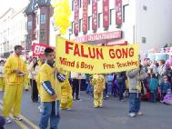 游行的队伍中,法轮功学员及明慧学校的队伍声势浩大。在弟子精心布置的花车上,有西方学员和小弟子们不断地展示五套功法。整齐的队伍及祥和的音乐又一次把‘真善忍’带给了华府大众。我们数位年轻女弟子,被主办单位特别邀请,身着各朝服装,走在游行队的前端,成为镁光灯的焦点。次日报纸还特别提及。