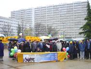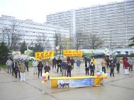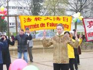 【明慧网2002年3月4日】初春的三月,法国大法弟子满怀喜悦的心情迎来了法国第一个法轮大法日:“枫德奈-苏-博瓦市法轮大法日”。庆祝活动的广场洋溢着祥和的大法音乐,到处可见五彩缤纷的大法横幅和气球。