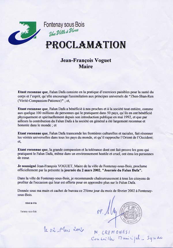 我,让-弗朗索瓦·福格,枫德奈-苏-博瓦市市长,正式宣布2002年3月2日为法轮大法日。