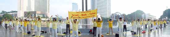 另一部份弟子前往雅加达省中心最大的喷水池(Bundaran Hote)圆周发正念、炼功。各国弟子身穿印有不同文种的黄色衣服,展开4幅3米长中印尼文的大法横幅。浩浩荡荡在印尼繁华大街徒步往返1小时40分,成为印尼今晨最亮丽的一道风景。弟子们边走边向路上行人、车辆发送真相资料,印尼民众争相取阅,沿途做生意小贩竟也停下来入迷地阅读。气氛热闹、喜悦。