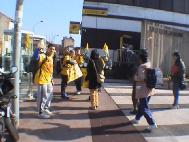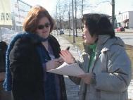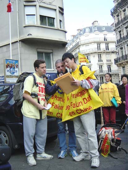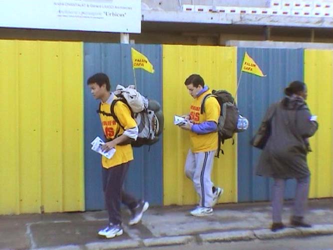 过往的行人们接过资料并向我们表示支持。也有些行人在看到横幅后前来询问,学员们把江泽民镇压法轮功的真相告诉他们,他们纷纷表示愤慨和谴责。