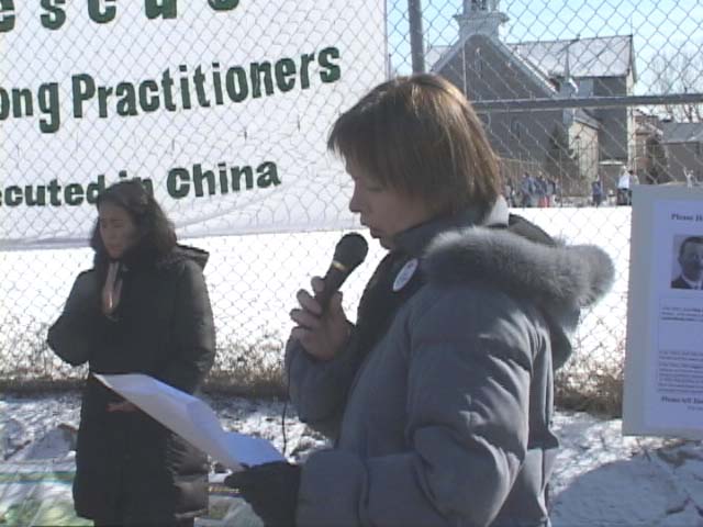 看到报导后,近三十名芝加哥的法轮大法弟子从3月7日上午10时到下午1时,齐集中领馆前发正念、炼功并向行人送发大法资料。弟子在临时制作的横幅上用英文写着:停止对法轮功学员的大规模杀戮。中文是:停止杀害修炼法轮功的中国公民。