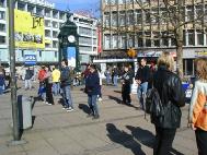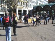 三月二日这天,从周边的不莱梅(Bremen)、汉堡(Hamburg)、卡塞尔(Kassel)和哥庭根(Goettingen)等城市陆续赶来的学员加上当地弟子共三十多人参加了这一活动。一位女学员带着两个幼儿也赶来了。学员们先集体发正念,并在每一轮炼功之前都发一次正念。天气出乎意外的好,晴空万里,初春的太阳照在身上暖洋洋的。汉诺威城里熙熙攘攘地挤满了周末来逛街的人群,当人们见到学员祥和的炼功场景,再看到SOS展板鲜明的对照,许多人被震惊了,大多数人对江泽民政府的迫害大陆学员一事表示不可理喻,不少人在要求释放熊伟的呼吁书上签名。不断地有人前来询问,打听炼功点和索要资料。也有不少人当场就跟学员学起功法来。