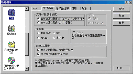 由于家用VCD机大都只能认ISO-9660的国际标准,因此在这里我们要ISO-1级的文件/目录名长度和ISO-9660的字符集,并且不要放宽ISO限制。这一切都设定好后就可以按“新建”按钮进入VCD节目的编辑了。