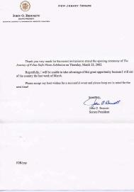 新泽西州参议院议长约翰·伯耐特(John O. Bennett)先生写信祝贺“法轮大法十年历程”图片展在泽西市(City of Jersey City)图书馆正式开展。