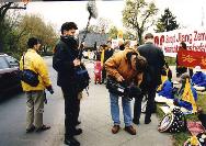 【明慧网2002年4月13日】4月10日中午,就在江泽民访问德国小城坡斯坦时,来自世界各地的大法弟子200余人在这里召开了新闻发布会。MAZ,ORB和坡斯坦地方报等报纸及电视台的新闻记者赶到现场采访。