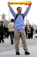 二十一岁美国大学生埃尔斯莫(Ellsomre)昨日下午在广场突然打出「法轮大法好」的横幅示威,并用中文高喊同样的口号。
