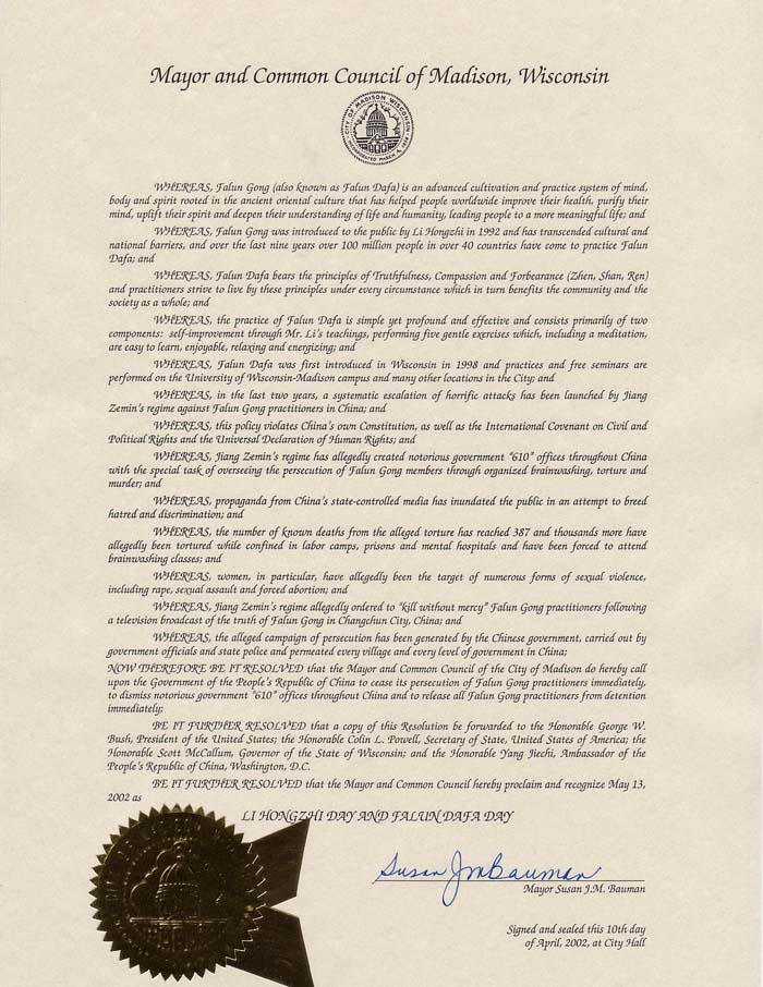 此外,威斯康星州麦迪森市市长和议会特此宣布并确认2002年5月13日为本市李洪志日和法轮大法日