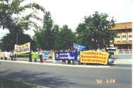 人间邪恶之首离开它的老巢北京,于4月8日到22日对包括德国在内的五国进行访问。为此,海外同修于2002年4月13日在明慧网上发出了同步持续整点发正念活动的通知,呼吁海内外大法弟子“在江泽民回到北京老巢之前将继续全天整点发正念清除邪恶”。