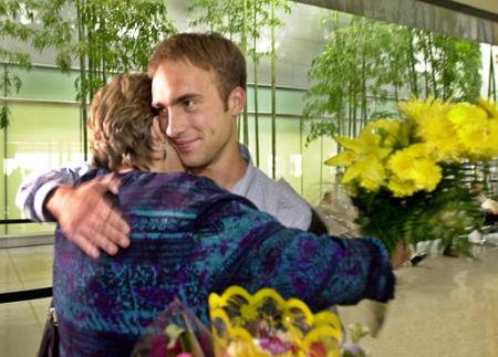 2002年4月16日星期二,21岁的安德列.穆尔.艾尔思默(Andrew Muir Ellsmore)在他从北京抵达三藩市国际机场时拥抱他的母亲辛迪.艾尔思默(Cindy Ellsmore)。中国拘留了艾尔思默,一名美国加州州立大学汉波特分校的三年级学生,因为他在北京天安门广场请愿抗议(江泽民)政府迫害法轮功,然后把他驱逐出境。艾尔思默的请愿是在中国一系列由外国法轮功支持者进行的抗议活动的最近一次。(美联社图片)