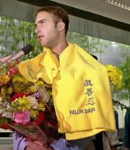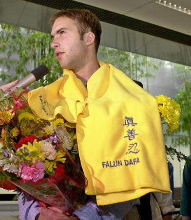 2002年4月16日星期二,21岁的安德列.穆尔.艾尔思默(Andrew Muir Ellsmore)在他从北京抵达三藩市国际机场时举行的记者招待会期间身着一个法轮功肩带。(美联社图片)